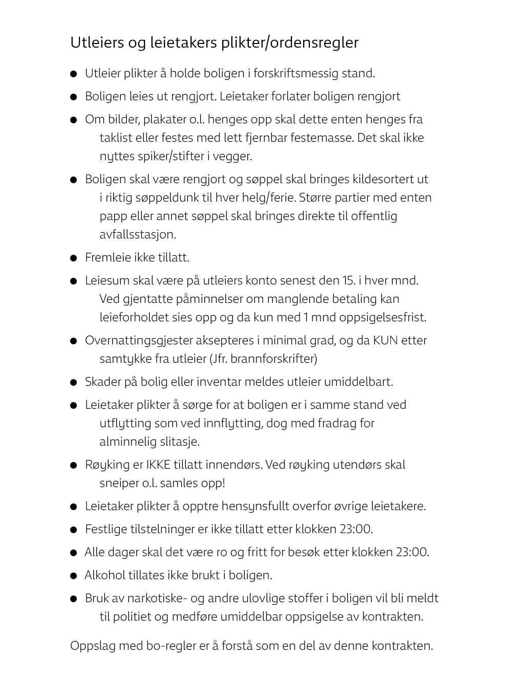 I kontrakten stod der blandt andet, at lejligheden skulle gøres rent hver uge, inden det blev weekend. Derudover var det ikke tilladt at drikke alkohol i lejligheden, skriver det norske medie NRK.no