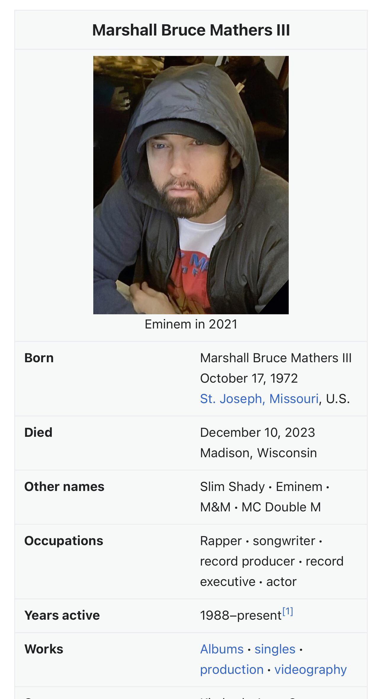 Falske rygter om rapperens død spredte sig lynhurtigt online. Hoaxen, der stammer fra en redigering på Wikipedia, blev dog hurtigt afkræftet. Misinformationen, der stammer fra en uautoriseret redigering af Eminems Wikipedia-side, påstod, at den 51-årige kunstner var afgået ved døden den 10. december 2023.