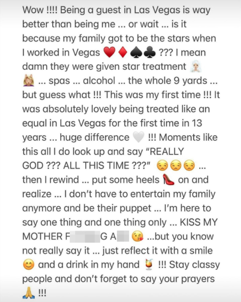 “Dette skete for mig i 4 måneder efter at jeg arbejdede for min far og min familie i 13 f***** g år … jeg gav alt, da jeg arbejdede, kun for bogstaveligt talt at blive smidt væk … jeg var ingenting mere end en marionet for min familie, men for offentligheden optrådte jeg bare på scenen og gjorde, hvad jeg fik besked på at gøre … men det var værre end det, fordi det blev accepteret og godkendt af de mennesker, jeg elskede mest,” skrev hun.