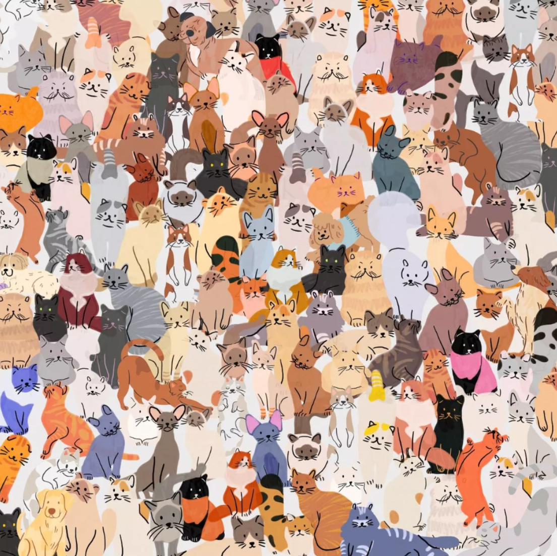 Billedet ligner ved første øjekast et kaotisk, men nuttet virvar af katte i alle tænkelige farver og former.