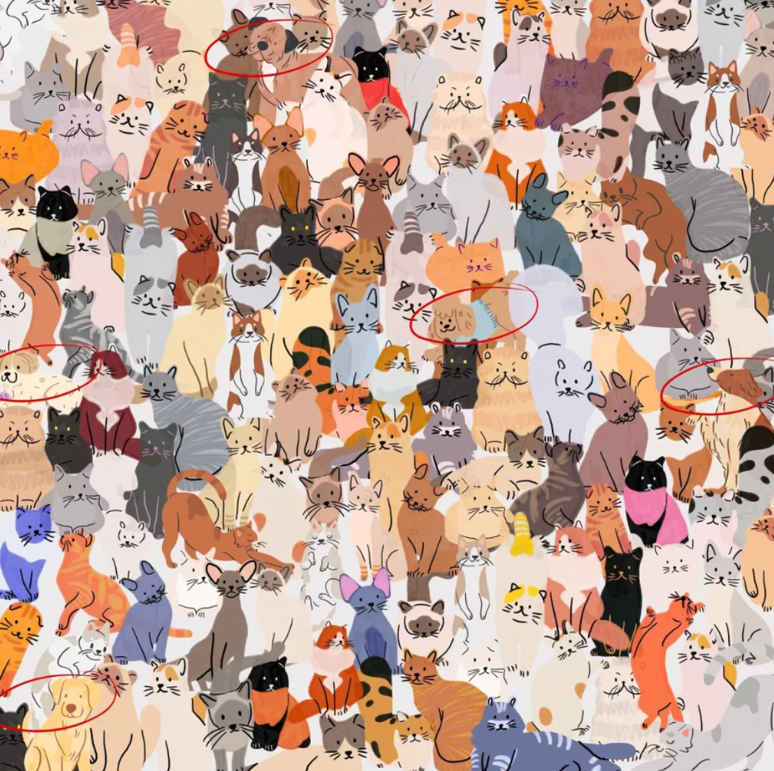 Målet er enkelt: Find de fem skjulte hunde, uden hjælp og helst på under 20 sekunder, hvis du virkelig vil teste din synsskarphed.
