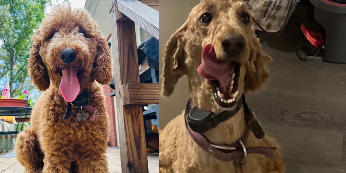Reba er familiens elskede goldendoodle, som er en hunderace kendt for sin bløde og krøllede pels og som kræver lidt mere opmærksomhed end de fleste andre hundes pels.