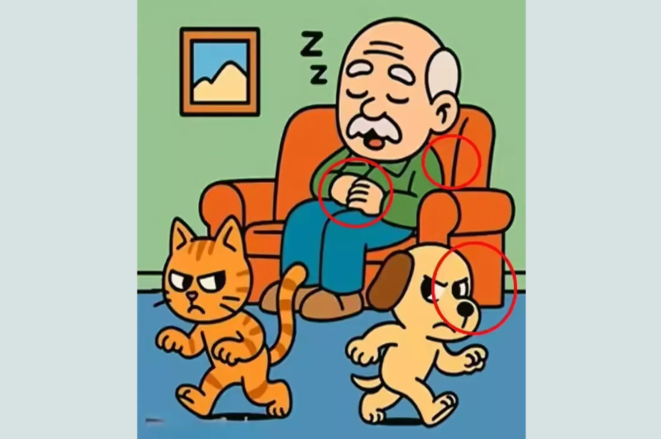 Folk, der har løst gåden, peger på tre detaljer: Den ene hundeøre mangler, mandens hænder har byttet plads, og ryglænet på stolen er mindre i det ene billede.