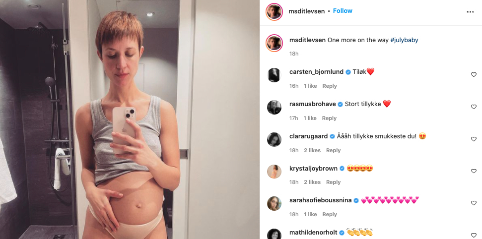 I et opslag på sin Instagram, hvor hun også viser babybulen frem, skriver Sarah Hjort nemlig: ‘One more on the way #julybaby’. Meget tyder altså på, at tre bliver til fire, og at parret til juli får et nyt familiemedlem.