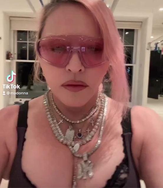Da Madonna vendte kameraet rundt, viste hun sin crop-top, som blottede hendes sorte blonde-bh, mens hun spankulerede frem iført flere sølvhalskæder.