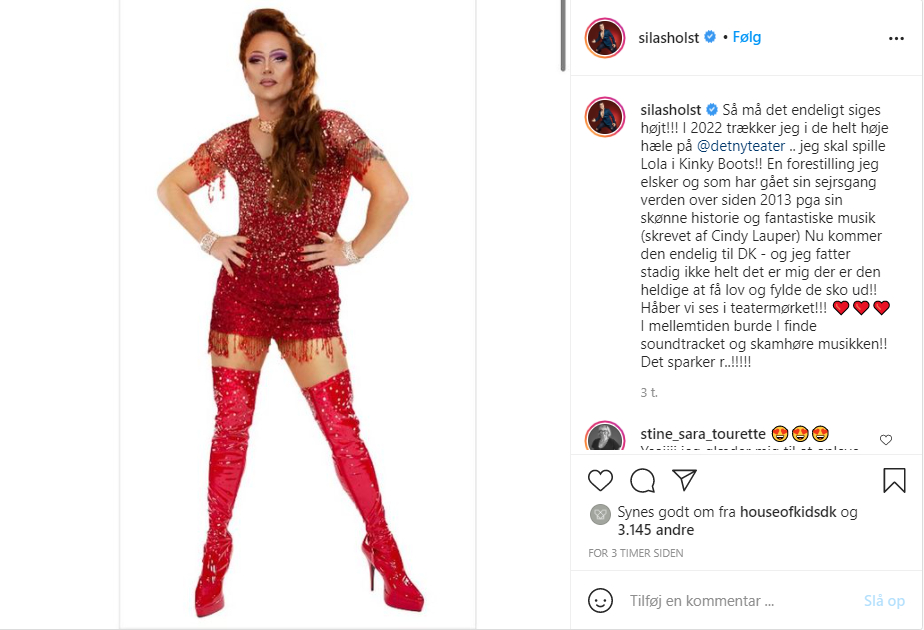 “Så må det endeligt siges højt!!! i 2022 trækker jeg i de helt høje hæle på @detnyteater.. Jeg skal spille Lola i Kinky Boots!!,” lyder det fra den begejstrede danser, som uddyber: