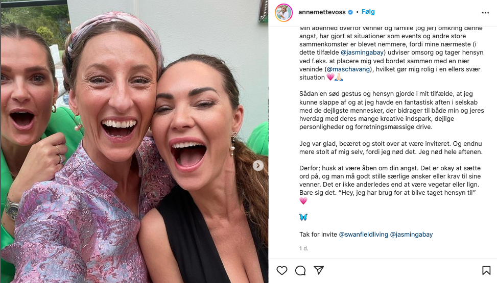 “Husk at være åben om din angst. Det er okay at sætte ord på, og man må godt stille særlige ønsker eller krav til sine venner. Det er ikke anderledes end at være vegetar eller lign. Bare sig det. “Hey, jeg har brug for at blive taget hensyn til,” skriver hun til sidst i sit opslag.