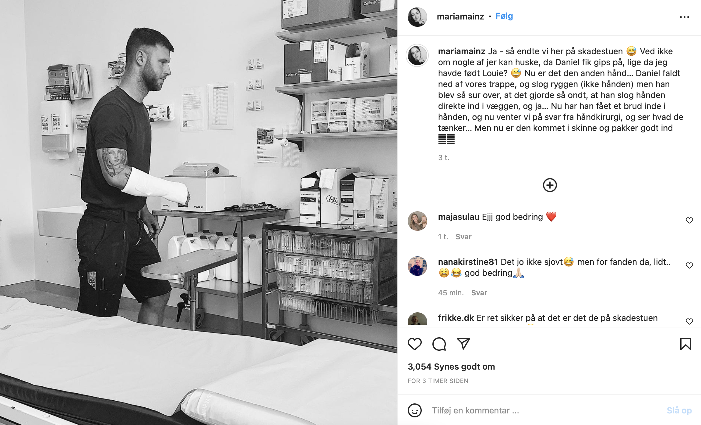 “Daniel faldt ned af vores trappe, og slog ryggen (ikke hånden) men han blev så sur over, at det gjorde så ondt, at han slog hånden direkte ind i væggen,” lyder det fra Maria.