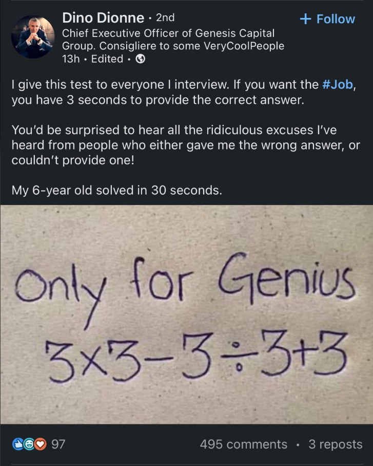 Gåden lyder: “3×3-3÷3+3” og er blevet introduceret som “Kun for genier.”