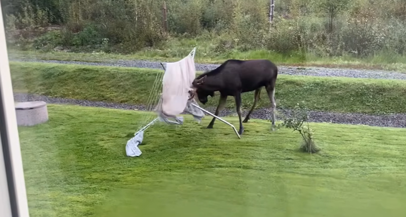 Elgen, der kom fra naboens have, gik målrettet mod tørrestativet, som de rodede rundt med i lidt for lang tid.