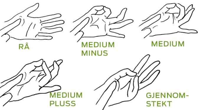Hvis dit kød føles på samme måde, som eksempelvis det første billede, så er kødet stadigvæk råt. Føles det i stedet som på det sidste billede, så er det gennemstegt.
