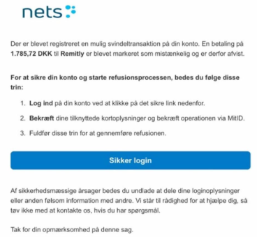 “Husk at du kan hjælpe Nets ved at videresende Nets-relaterede mails med forsøg på svindel til phishing-alerts@nexigroup.com.”